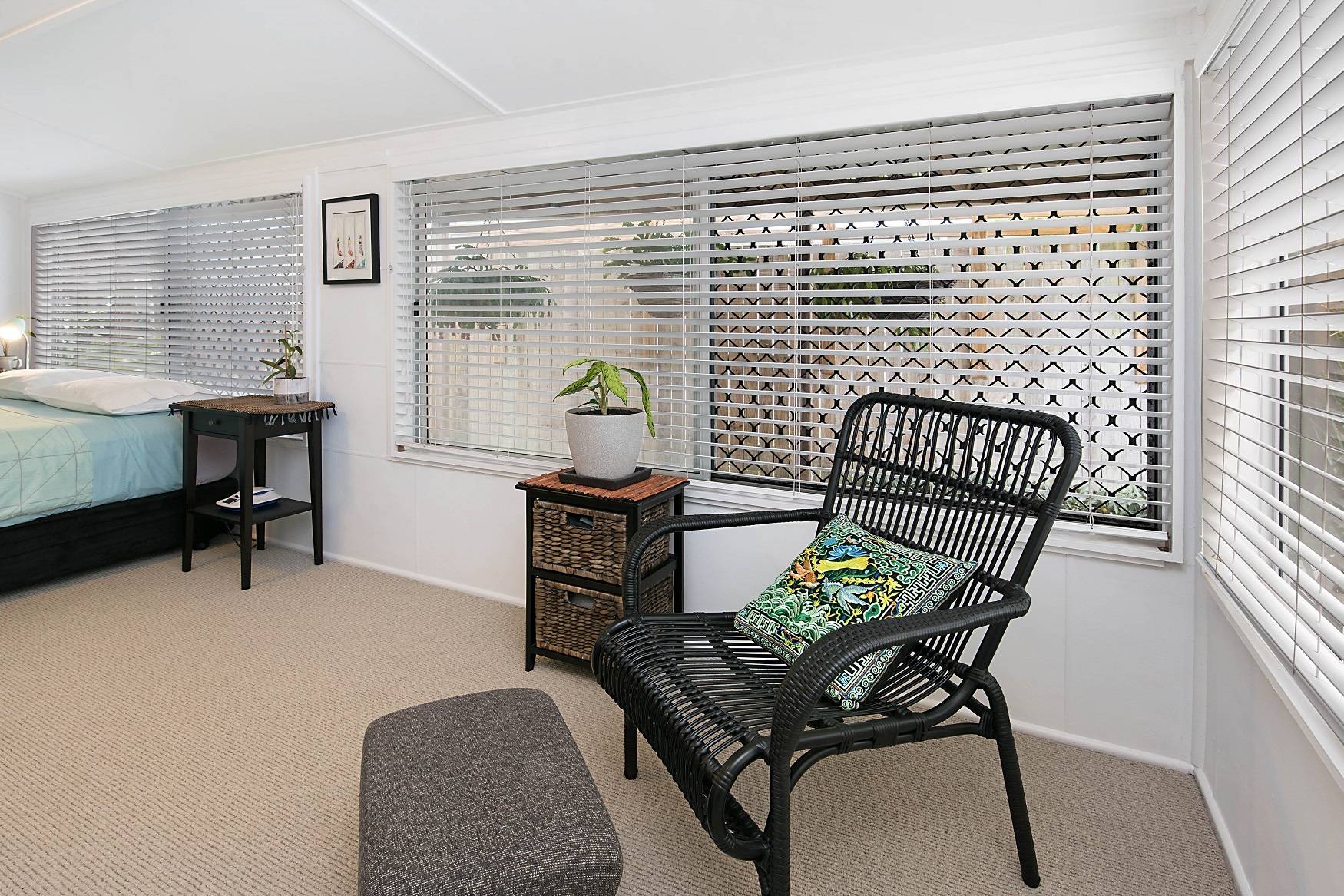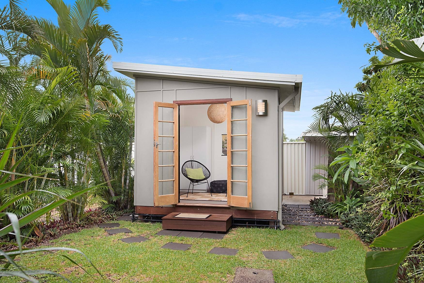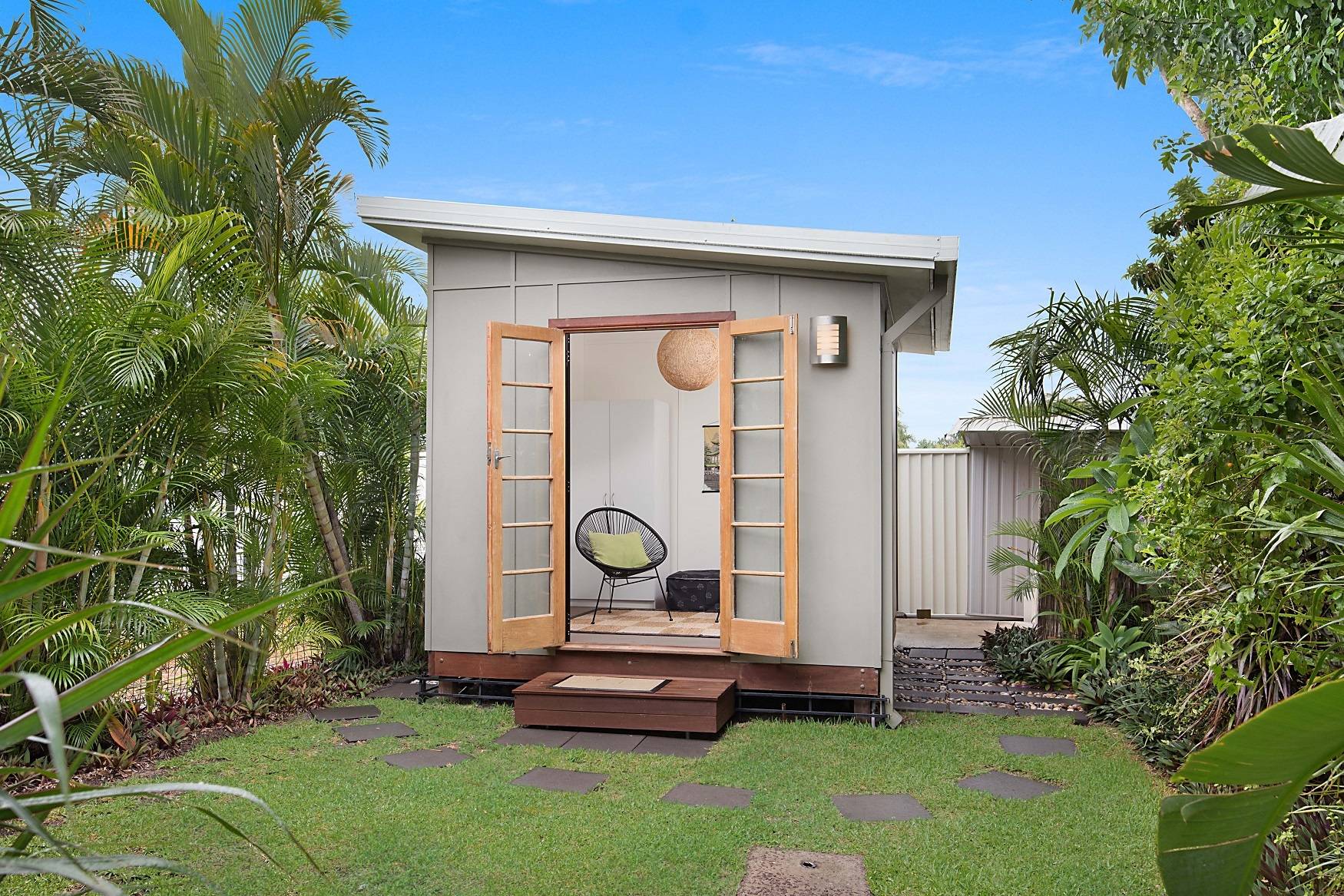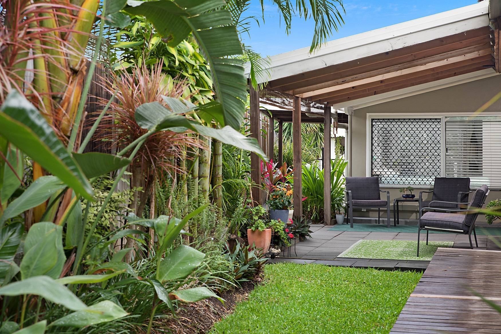 A walk in robe features in the large master bedroom and this room is positioned away from the second bedroom for privacy. This bedroom has built in robes. The bathroom also features a modern renovation. The undercover entertaining area is where you can relax and enjoy the tropical gardens. The detached rear modern studio makes for an ideal office or retreat and the garden shed will keep your tools in order. If you love privacy and tranquility then this is the property for you.