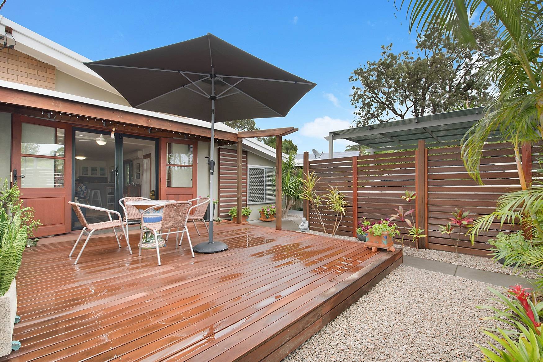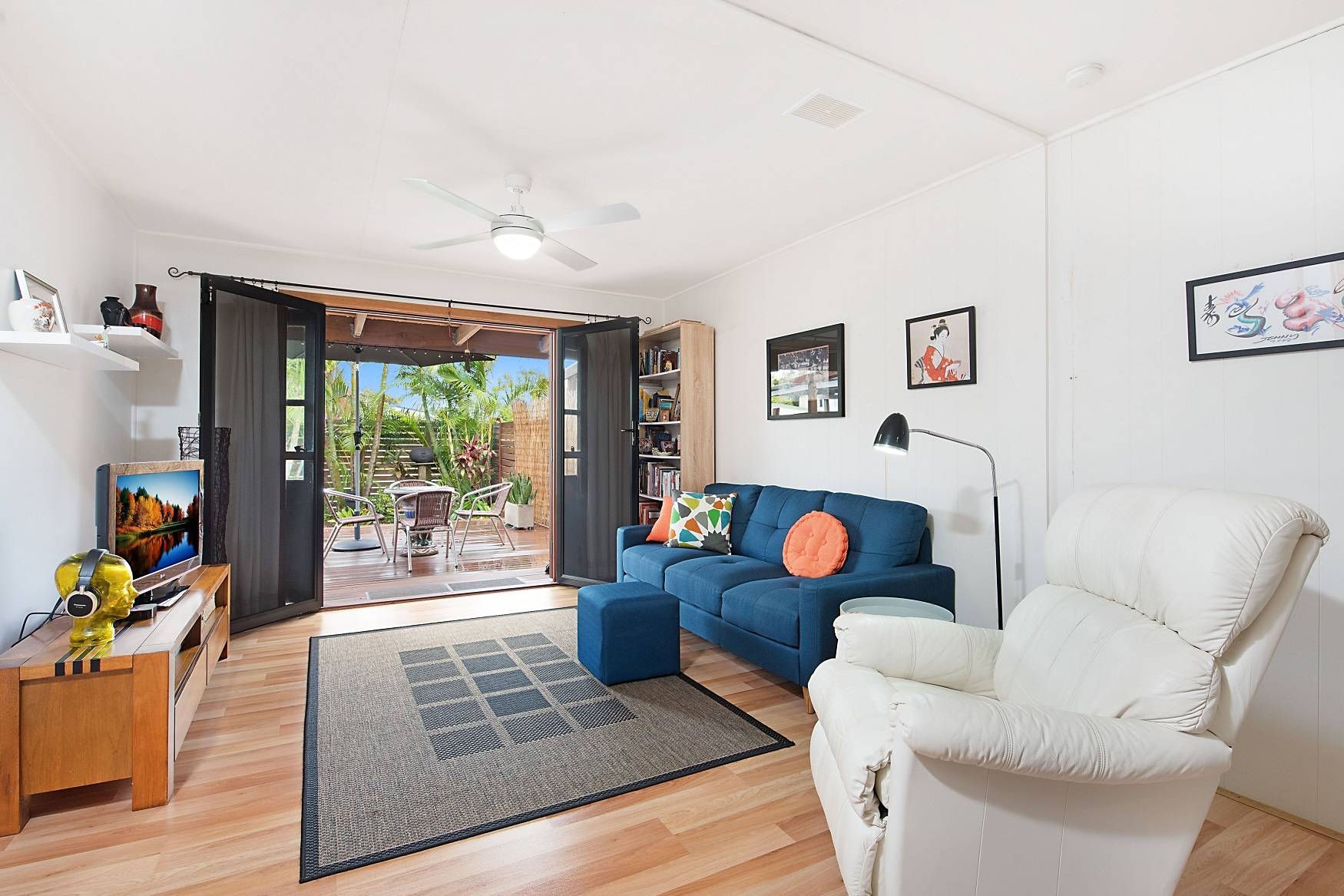 Relax on the large front timber deck then enter through the French doors to the spacious open plan living room.