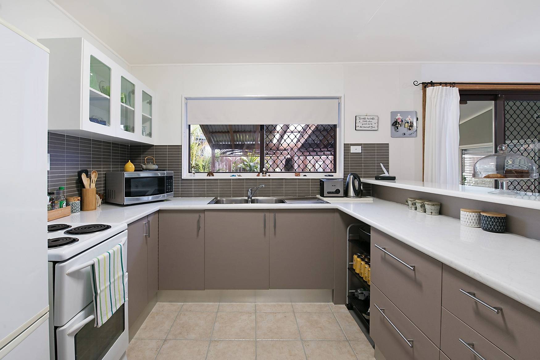 The renovated Caesar stone look kitchen has ample cupboard and benchtop space.
