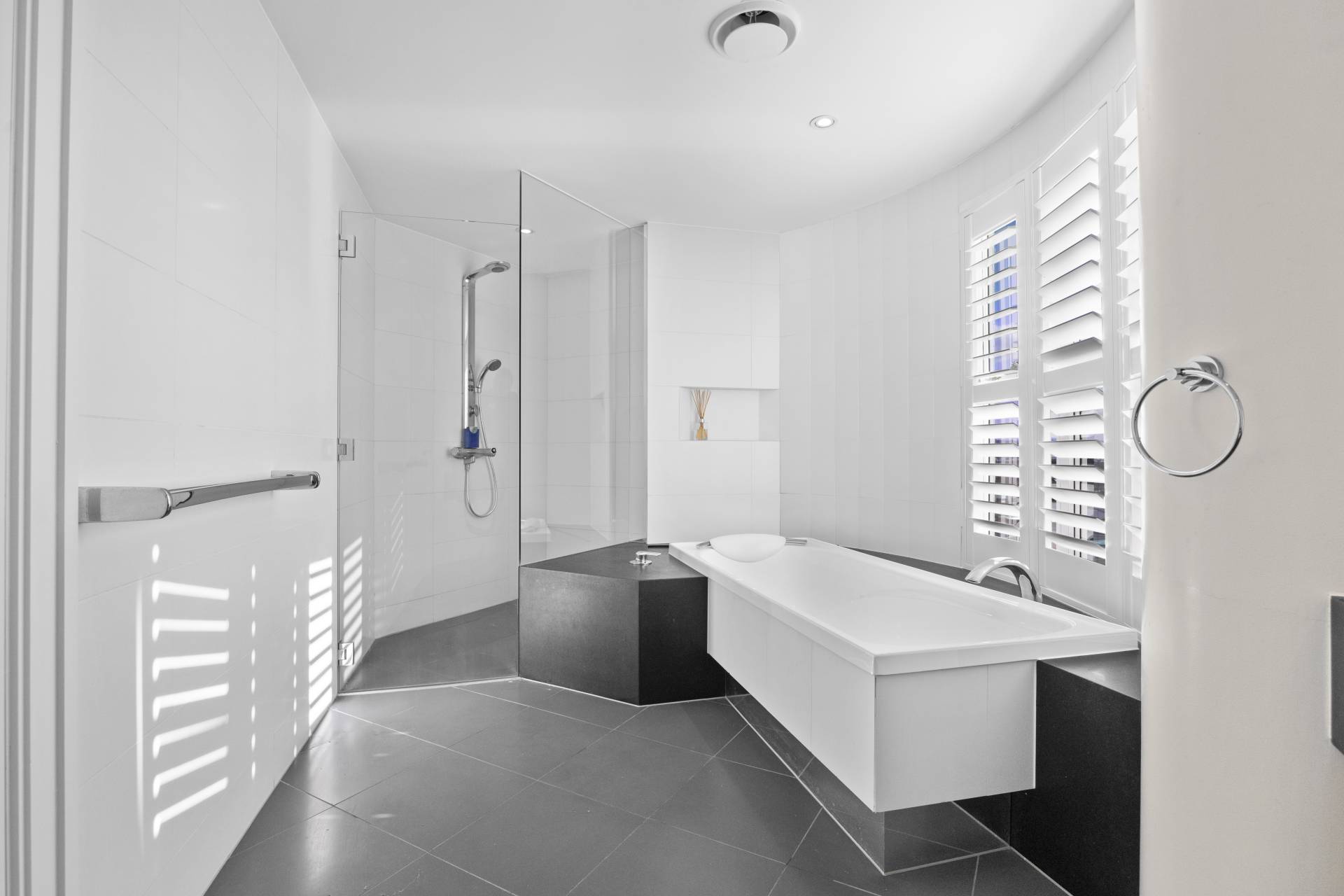 - Large master bedroom upon entry boasting a custom walk-in robe, modern sleek ensuite encompassing dual vanities, separate toilet and French doors opening onto the deck