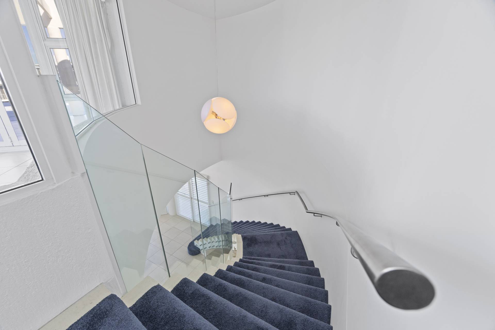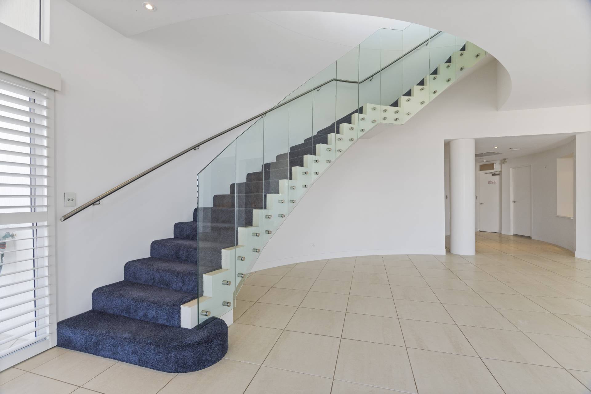 - Curved glass-encased staircase leading up to the residence's exclusive-use second level