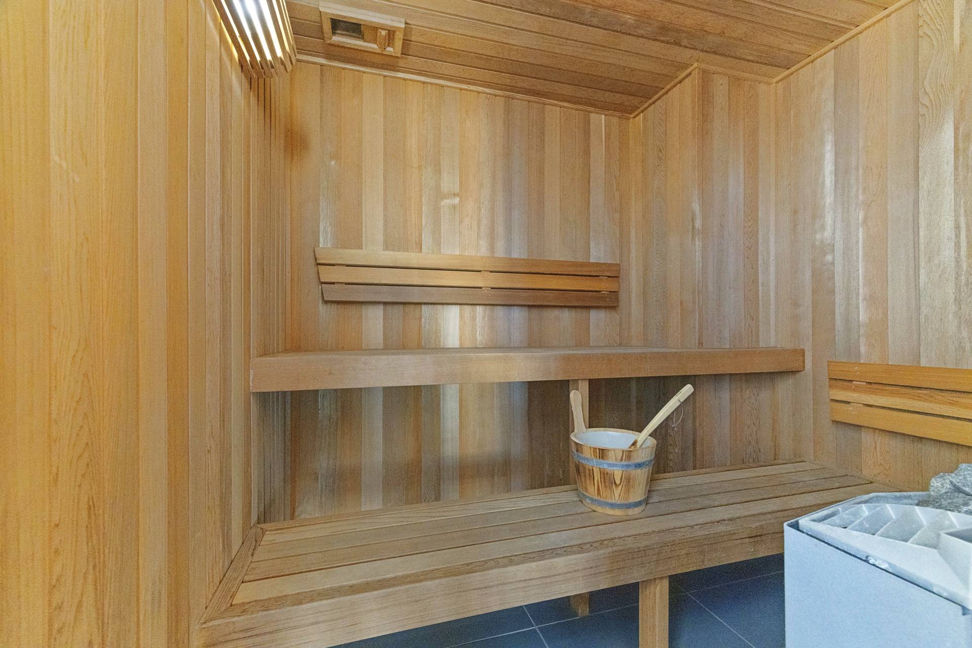 - The second level includes: Timber sauna, full bathroom, AstroTurf, a sheltered sunroom, two open deck areas and a private heated swimming pool