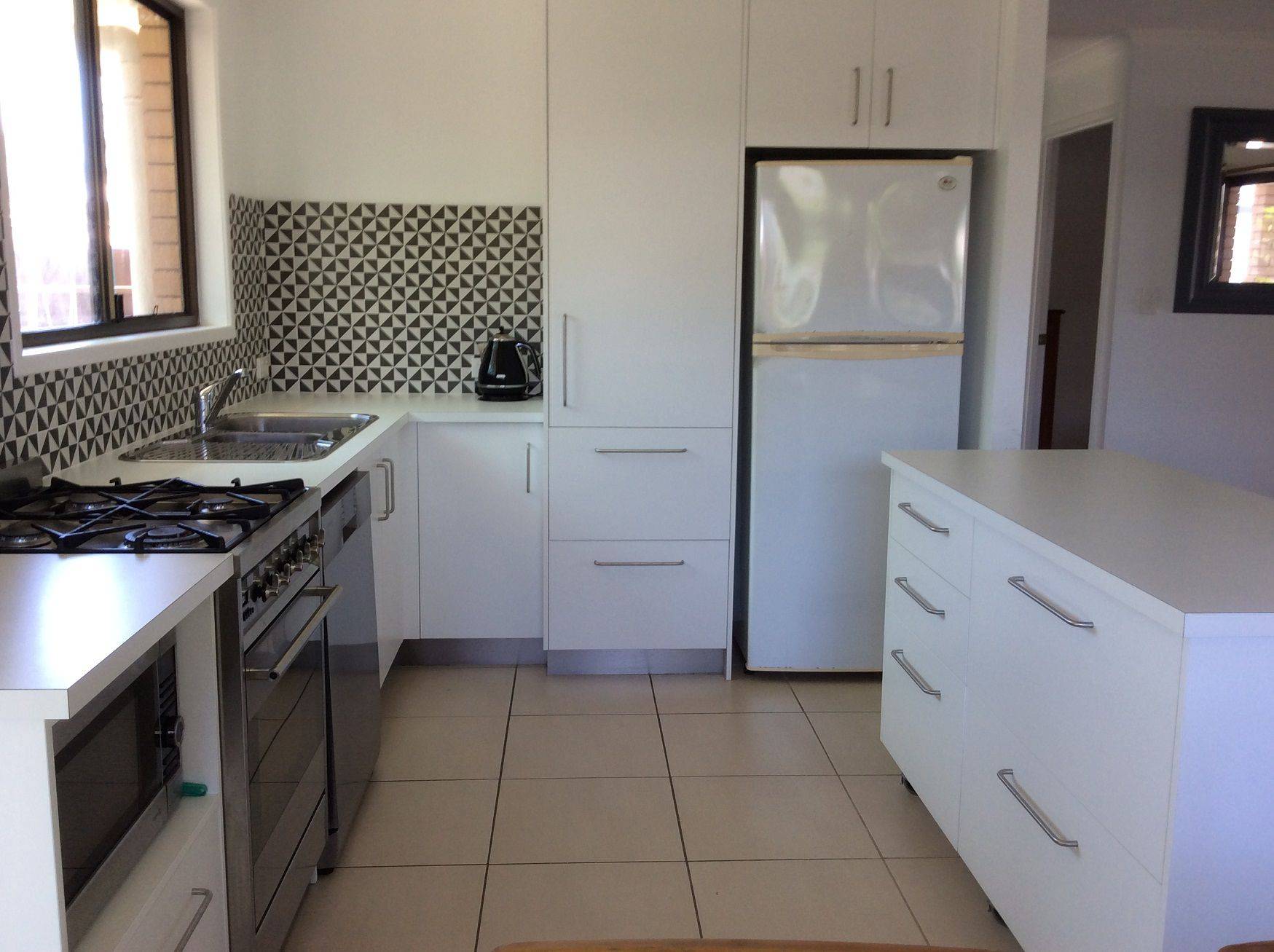 The modern kitchen boasts stainless steel appliances with a separate island bench.